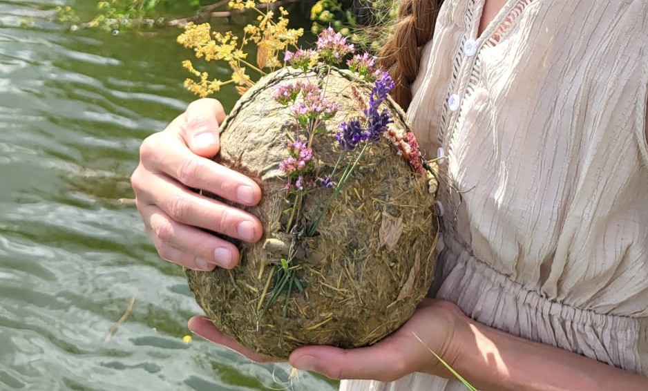 Ze was altijd zo kuis met haar lichaam. Het voelde kaal en confronterend om haar zomaar uit te strooien. Dat bracht me op het idee om met gras, bloemen en kruiden een urn te maken.